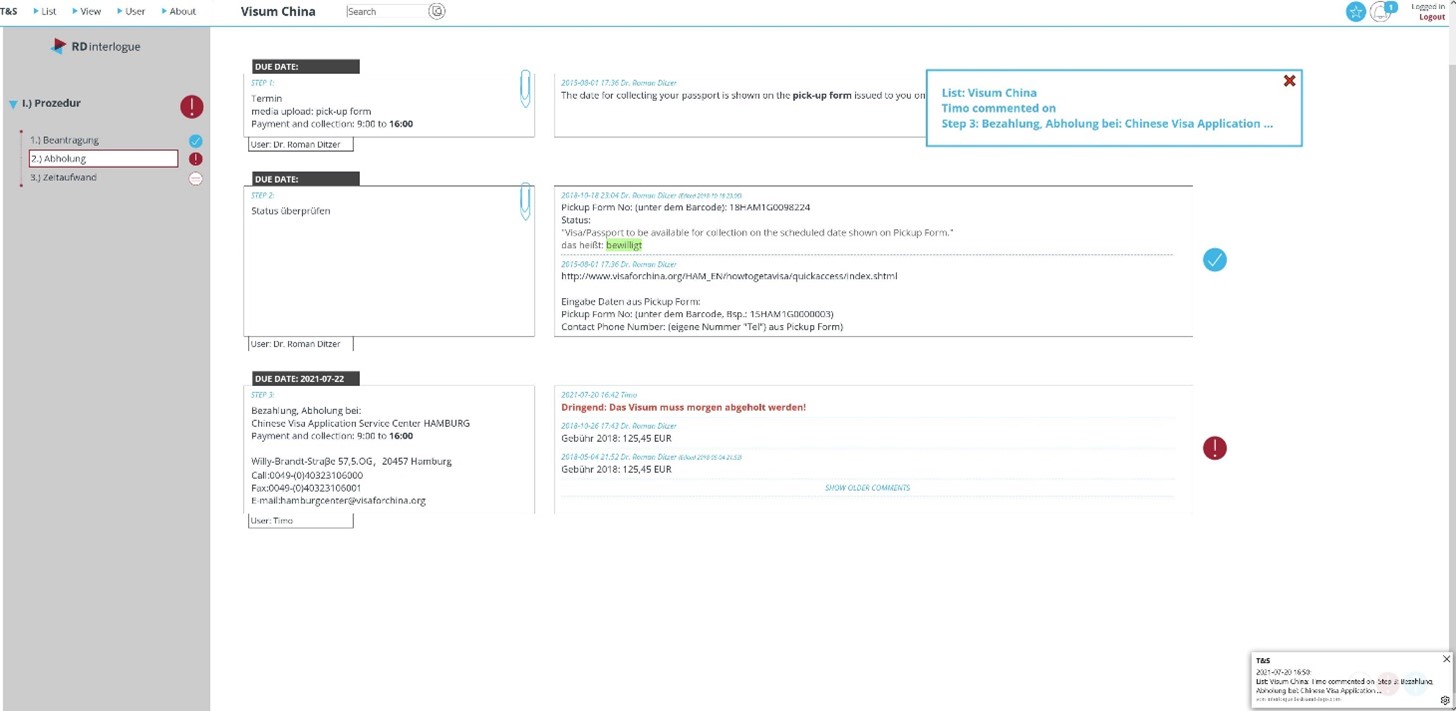 Zur Steuerung und Koordination von Aufgaben im Rahmen einer arbeitsteiligen Zusammenarbeit können Einzelschritte an Nutzer zur Durchführung zugewiesen und ggf. mit Terminen versehen werden. Die Nutzer erhalten über Popup-Benachrichtigungen und eine Logbuch-Funktion Rückmeldungen zum Stand der jeweils zugewiesenen Einzelschritte.